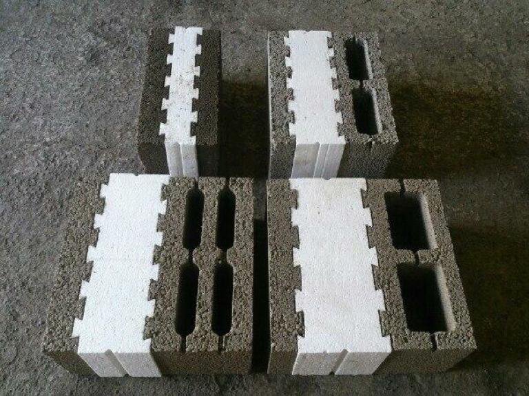 Такие строительные блоки изготавливают из цементного раствора и гранул полистирола в качестве наполнителя. Сухая смесь разводится водой и заливается в формы. После застывания раствора блоки готовы к применению. Геометрия элементов может иметь некоторые расхождения, но определенным преимуществом данной технологии является то, что блоки легко поддаются обработке.