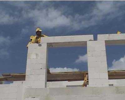 Балки на оконные и дверные проемы можно установить готовые, а можно и сделать самому, установив опалубку и залив ее бетоном. Перед установкой балок тоже производится армирование. Стены внутри здания можно сооружать пеноблоками, поставленными на ребро. Но нужно учитывать то, что если на краю стены будет лежать плита перекрытия, тогда пеноблок укладывается плашмя, для увеличения площади, на которую будет опираться перекрытие.