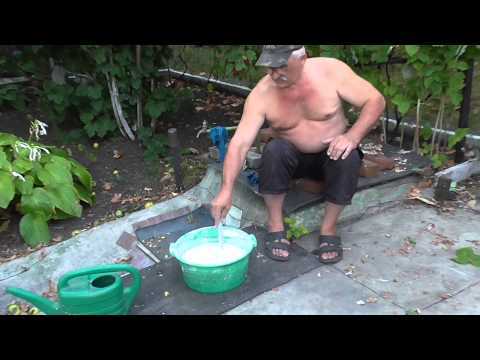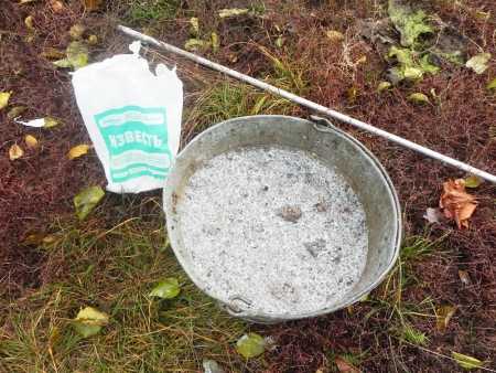 В какой пропорции разводить известь с водой, честно сказать, я не помню. Но я точно помню, что нужно взять два килограмма извести и растворять ее в воде до тех пор, пока не получиться очень жидкий состав, раза в два плотнее воды.