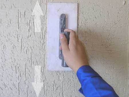 - Работы желательно проводить вдвоем. Пока один наносит и разравнивает состав, другой придает ему форму. Если такой возможности нет, то поверхность сразу разбивают на несколько зон и делают их поэтапно. Это важно, ведь нанесенный состав быстро схватывается, и формировать рельеф надо сразу.