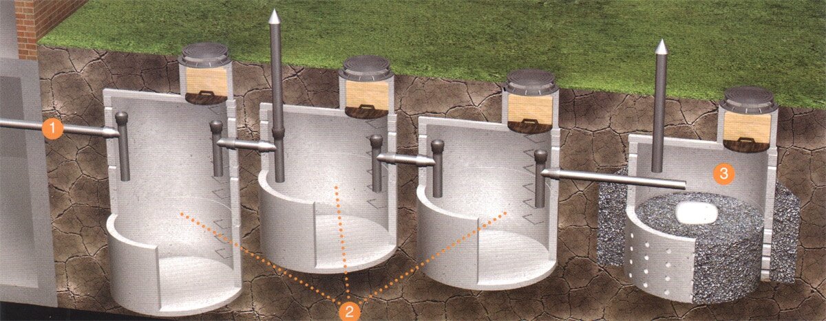 Сточные воды поступают в резервуар для очистки, где твердые отходы откладываются внизу, шлак — вверху, а сточные воды — в центре. Сточные воды относительно чистые. Таким образом, он проходит через ряд труб, скрытых под зоной выщелачивания. Некоторые системы вставляют разделительную коробку между трубой и резервуаром для более равномерной подачи сточных вод. Заключительный этап фильтрации перед возвратом очищенных стоков в окружающую среду происходит в точке выщелачивания.