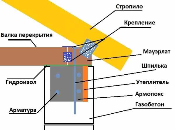 Также мы рассмотрим задачи армопояса, требования к его ширине и высоте, утепление, армирование, опалубку и схемы крепления кровли к армопосу.