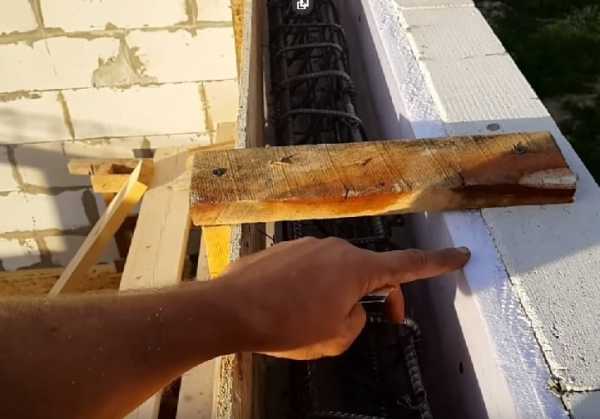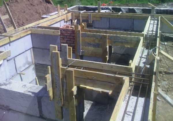 Если проведение работ по монтажу армопояса планируется поэтапным, то заливку проводят по принципу вертикального отсекания. То есть полностью по высоте заливается каркас до определенного места, затем проводят выставление перемычек. Материалом для перемычек может служить кирпич или газоблок.