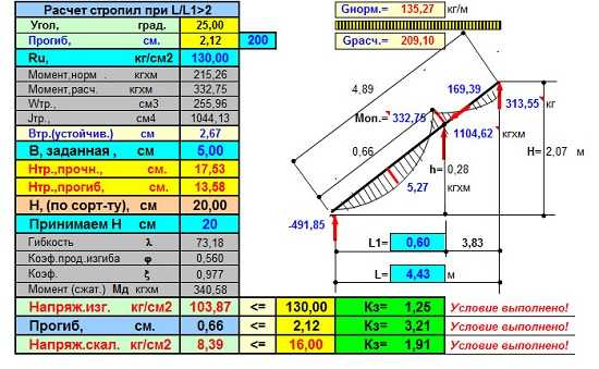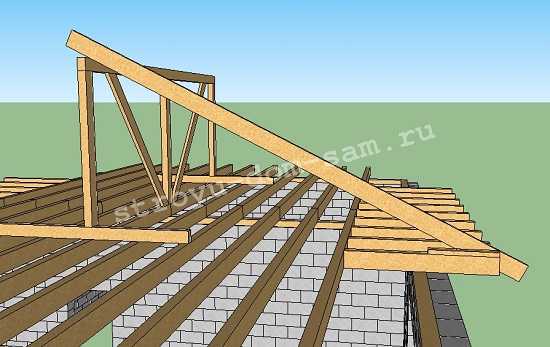 Если длина пролёта перекрываемого угловым стропилом (его горизонтальная проекция) больше 7,5 метров, ставим ещё стойки примерно на расстоянии ¼ величины пролёта от верхней точки углового стропила. Если пролёт больше 9 метров, добавляем стойки посередине углового стропила. В нашем примере этот пролёт равен 5,2 метра.