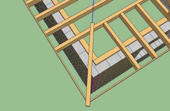 ШАГ 9: Устанавливаем стойки под угловые стропила. В первую очередь обязательно нужно поставить стойку упирающуюся в место соединения углового выноса с балкой перекрытия (см. рис. 22):