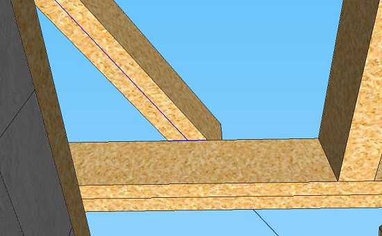 У вальмовой крыши, которую я описывал ранее, углы наклона скатов и вальм были одинаковые. Здесь эти углы разные и поэтому угловое стропило будет иметь свои особенности. Мы также делаем его из двух досок такого же сечения, что и стропила. Но доски эти сшиваем между собой не совсем обычно. Одна будет чуть ниже другой (примерно около 1 см, в зависимости от разницы углов наклона скатов и вальм).
