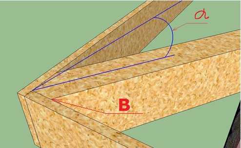 Теперь изготавливаем первую половинку углового стропила. Для этого берём доску подходящей длины. Если одной доски не хватает, сшиваем две доски. Сшить можно временно обрезком дюймовки длиной около метра на саморезы. Делаем по шаблону верхний запил. Измеряем расстояние между точками «А» и «В». Переносим его на стропило и делаем нижний запил под углом «α».