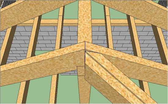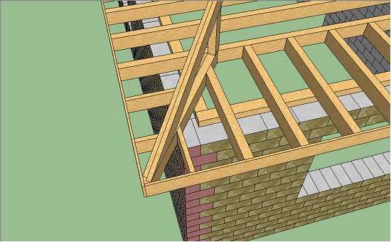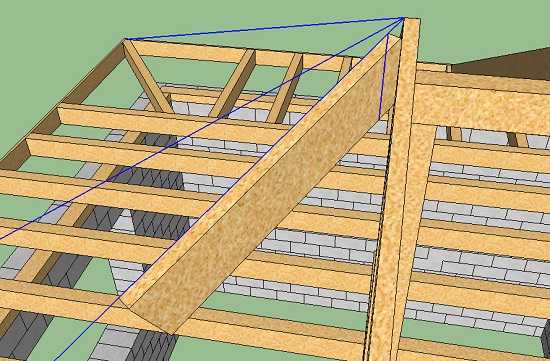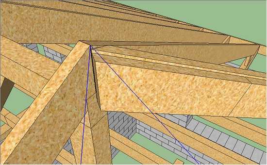 Скорее всего из-за своей длины первая половинка углового стропила будет прогибаться. Нужно примерно посередине поставить под него временную стойку. На моих рисунках она не показана.