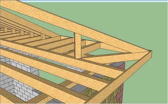 Заносить эти подпорки дальше внутрь крыши и уж тем более ставить их на стык выноса с балкой не нужно. Через них передаётся большая часть нагрузки с кровли (это можно будет увидеть в расчётной программе) и балка перекрытия может просто не выдержать.