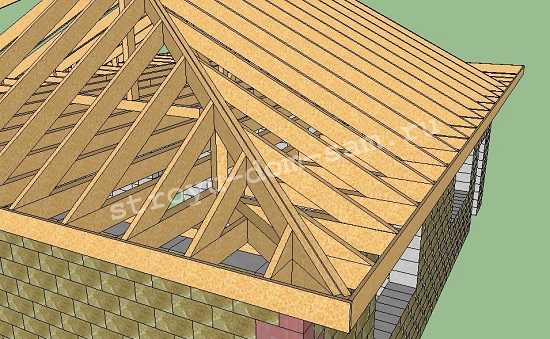 Конструкция вальмовой крыши с опиранием стропил на балки перекрытия.