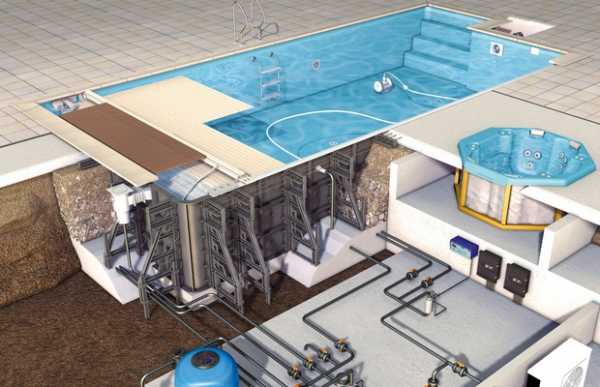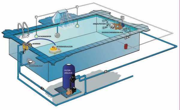 - После завершения работ по декоративной отделке выполняется монтаж основного эксплуатационного оборудования: водяного насоса, устройств очистки и подогрева воды, осветительных приборов.