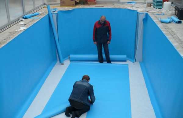 ПВХ пленка для отделки бассейнаЕсли вы решите использовать для отделки бассейна ПВХ-плёнку, вам не понадобится выполнять для неё отдельную гидроизоляцию, но если вы опасаетесь, что она не выдержит воздействия воды, можете выполнить в один слой обработку стен бассейна жидким водоотталкивающим раствором. При этом старайтесь приобретать плёнку толщиной не менее 3 мм. Если же вы боитесь, что упадёте в бассейне, имеет смысл приобрести пленку с шероховатой поверхностью.