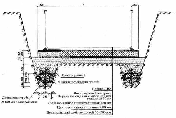 - Дно обустраивают водонепроницаемой подушкой из песка и гравия. Вначале насыпают песчаный слой высотой до 8 см, затем – слой гравия в 5 см, после чего все тщательно трамбуют с использованием трамбовки.