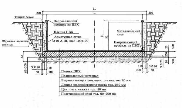 Схема устройства стационарного бассейнаПосле того как гидроизоляционные материалы будут выложены, можно приступить к заливке бетона слоем в 10-15 см. Для этого используют цемент высоких марок, взятых из расчёта 1 часть песка на 2 части цемента. Сверху слоя бетона кладётся выполненная из металла армирующая сетка, она заливается финишным слоем бетона.