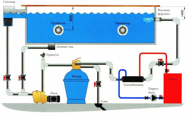 Схема монтажа теплообменника для бассейнаКроме финишной отделки, по окончании строительства бассейна нужно будет установить оборудование по подаче и фильтрации воды, её очистке и подогреву. Только после этого можно будет считать процесс его возведения законченным.