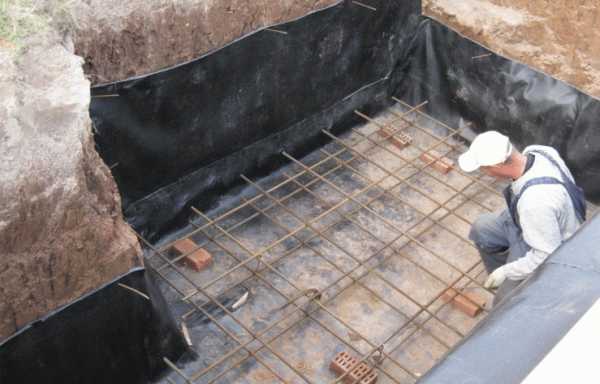 Сверху прокладывают слой гидроизоляции – можно использовать пленку из полиэтилена или рубероид. Мокрый грунт требует многослойной гидроизоляции. Стелют пол и заходят на стены ямы. Потом заливают пол раствором бетона слоем в 13-15 сантиметров. Заливка осуществляется без перерывов, с равномерным распределением слоя и уплотнением глубинным вибратором или штыкованием.