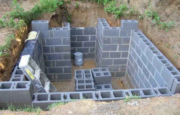 Готовый бетонный погреб делают после заливки пола, собирая из фундаментных блоков. Блоки собираются с использованием кладочного раствора с гидроизолирующими добавками. Сборка происходит благодаря кладочному раствору и специальным пазам. После сборки вся поверхность блоков обрабатывается гидроизолирующим средством (типа Дегидрол Люкс марки 3).