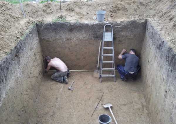 До того, как заливать бетонный погреб своими руками, нужно выполнить земельные работы. Сначала тщательно расчищают территорию, удаляют верхний слой грунта и дерн, размечают границы котлована колышками и шнуром. Основную часть грунта копают экскаватором, треть объема можно вырезать штыковой лопатой.