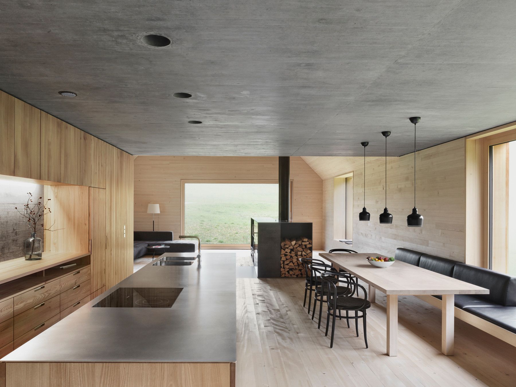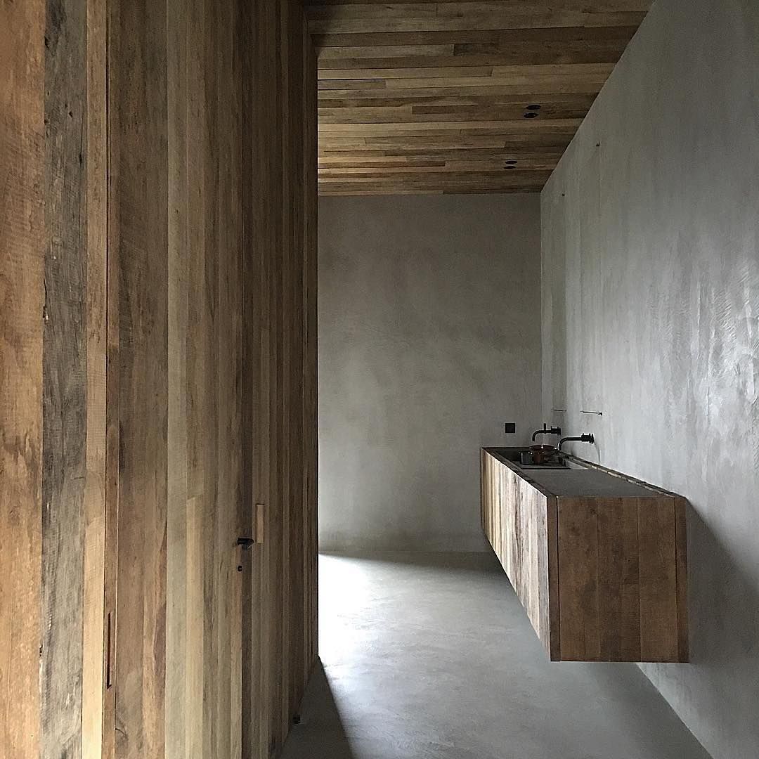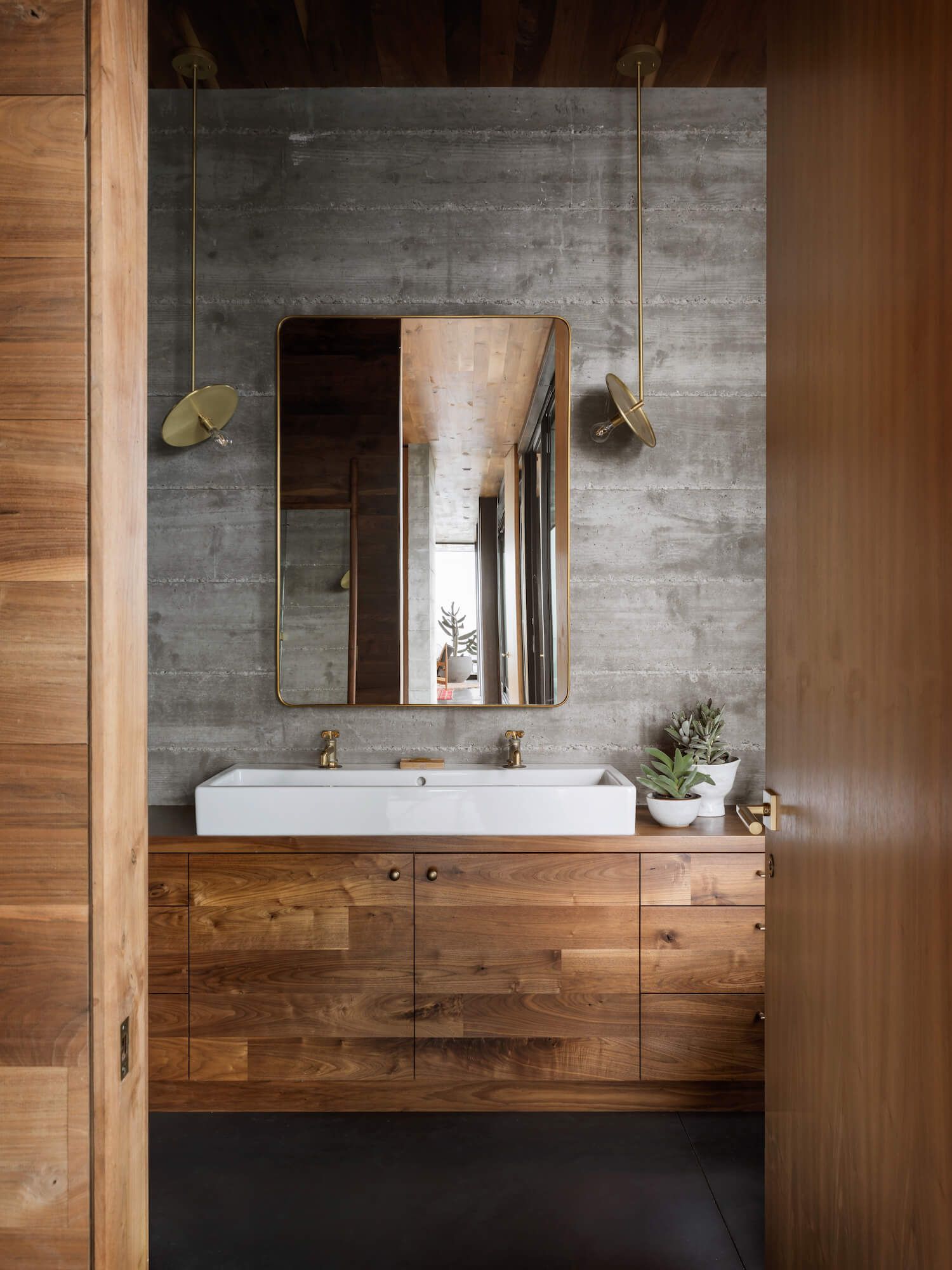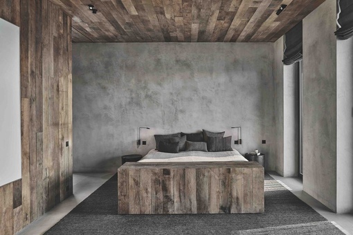 Немного шершавая поверхность бетона отлично смотреться в контексте гладкого потолка, изготовленного из дерева.