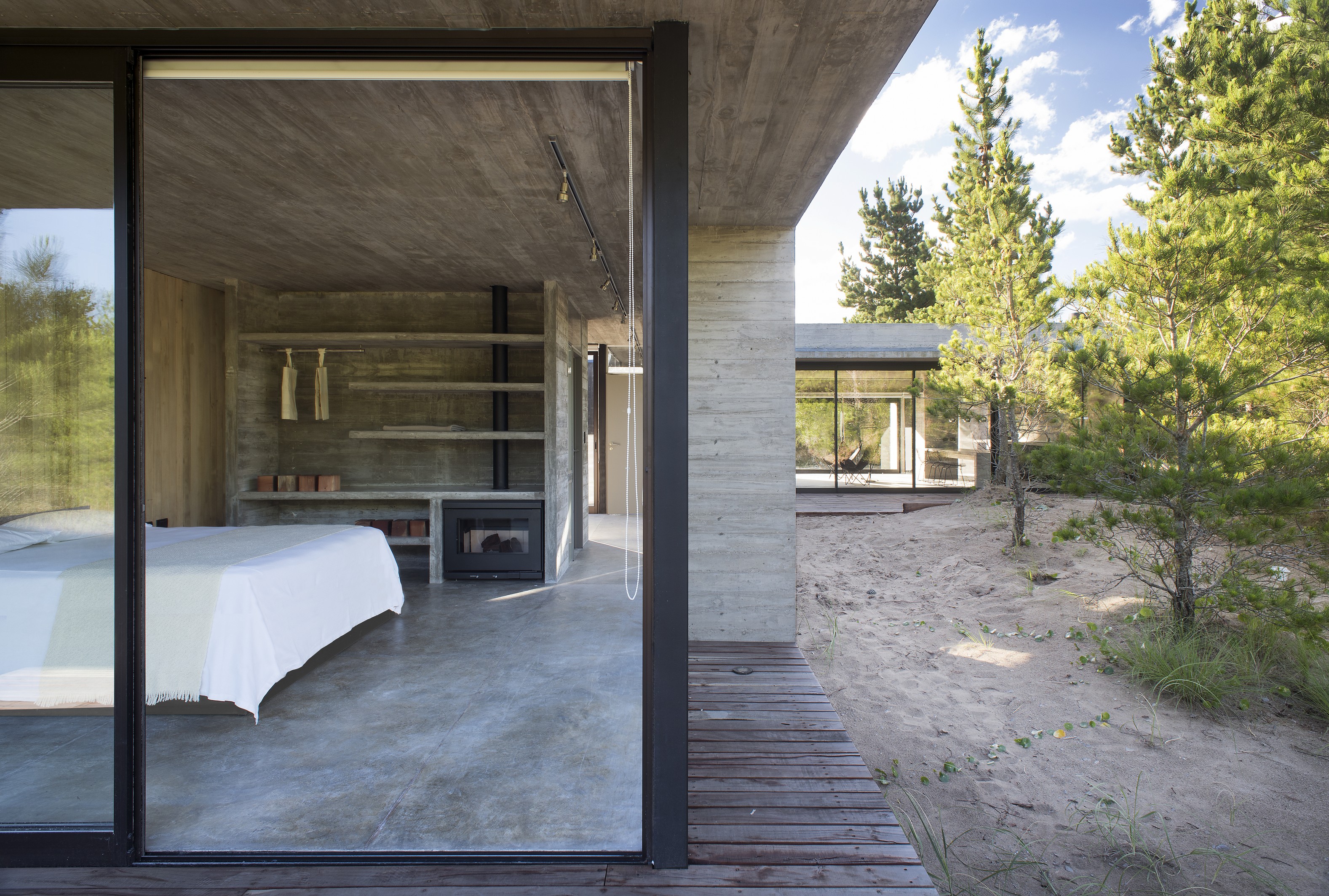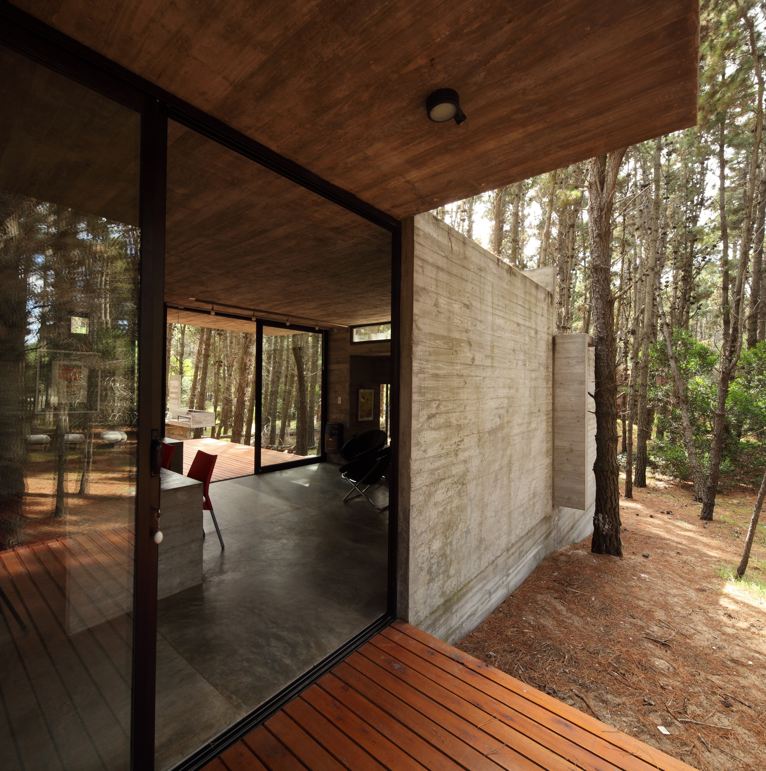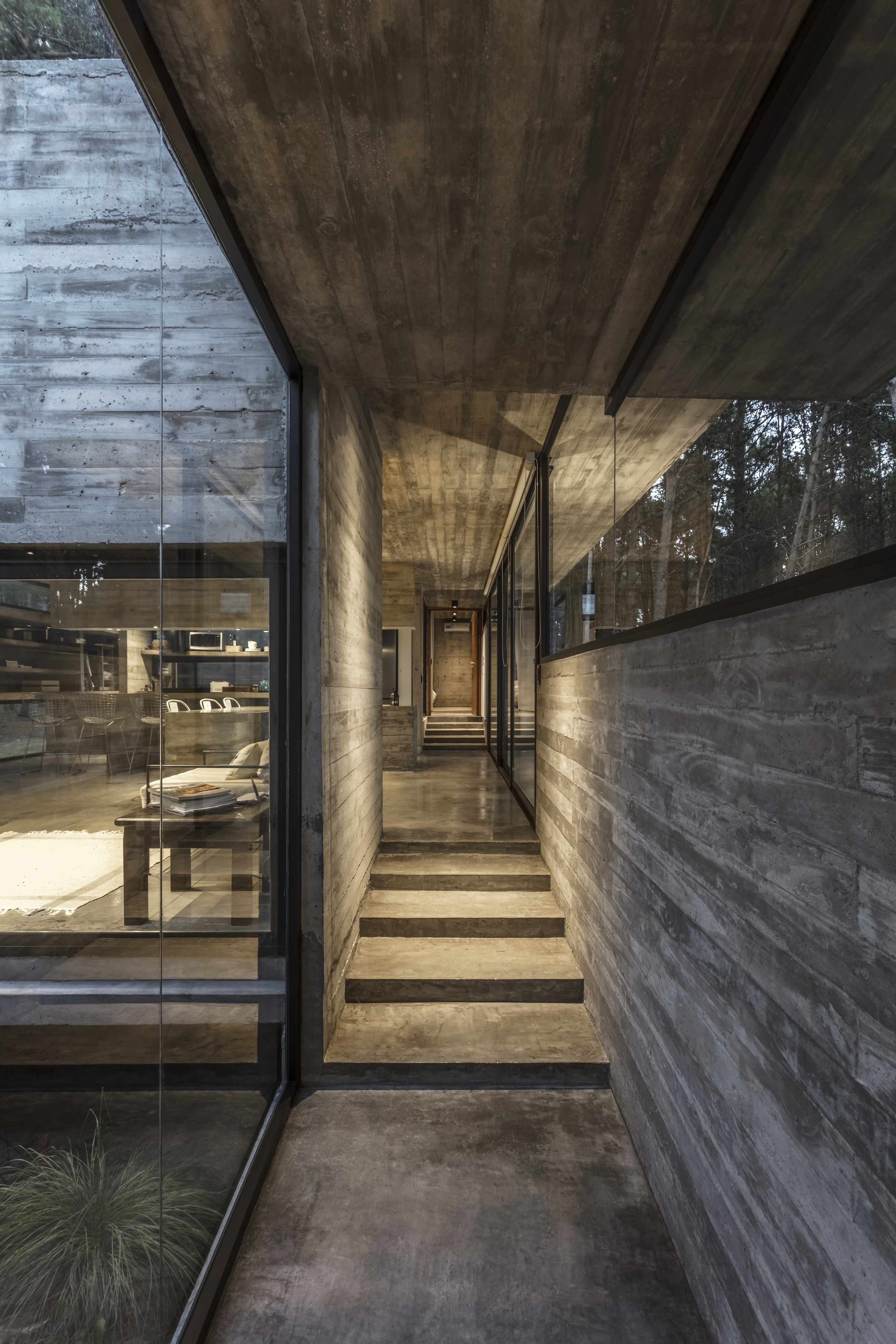 Немного шершавая поверхность бетона отлично смотреться в контексте гладкого потолка, изготовленного из дерева.