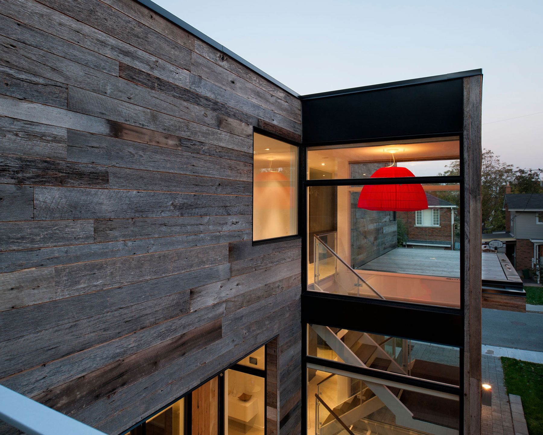 Кирпичная кладка фасада придаёт всему зданию несколько винтажный вид, что делает применение металла, из которого изготовлены оконные рамы и двери гаража, несколько необычным. Но несмотря, ни на что все эти действия довольно актуальны, а полученный образ не только смог сохранить частичку истории в своём облике, но и приобрести новые запоминающиеся современные стилистические штрихи.