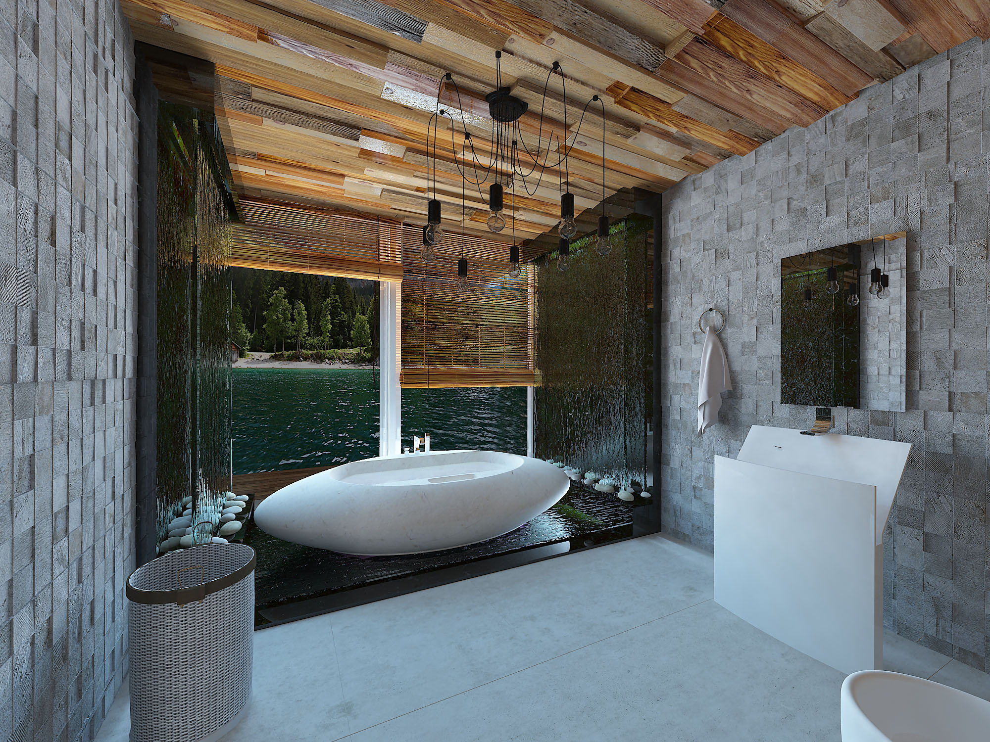 Использование древесины в качестве основного материала для потолочного покрытия, сорт которой отличаются светлым оттенком, позволяет расслабиться во время принятия ванны и полностью забыть об обилии камня, который вас окружает. Именно такое сочетание цветов в интерьере имеет наиболее положительный эффект.