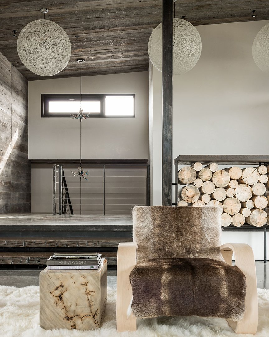Отличительным свойством такого интерьера является то, что конкретные плоскости оформлены при помощи одних материалов. То есть, если это стены, то они изготовлены из бетона, если это потолок, то соответственно применяется древесина.