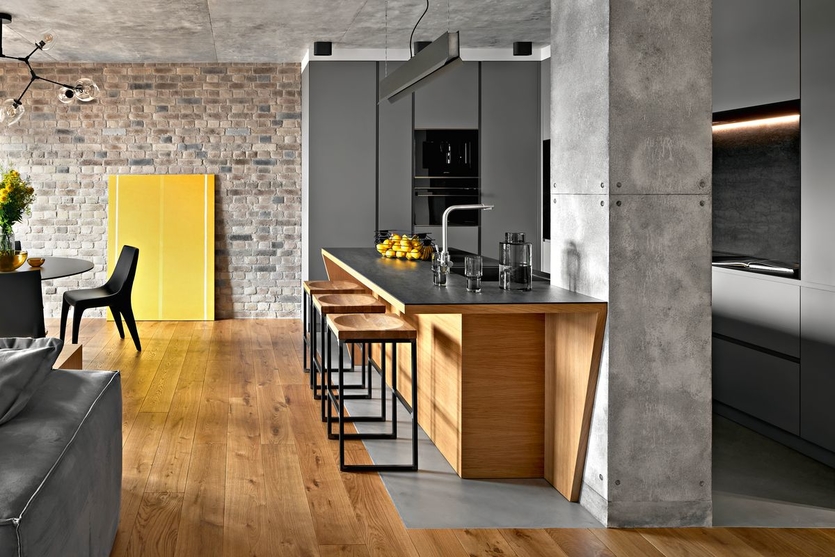 Взаимосвязь этих элементов формирует чёткий интерьер, основанный на контрастах противоположностей. Серость и холод – эмоции, которые несёт бетон, полностью растворяются в тепле и домашнем уюте, формируемом благодаря дереву. Любые предметы декора и интерьера, установленные внутри такого помещения, имеют особый акцент, который придётся по нраву каждому.