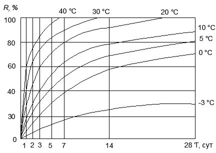 Просмотрев таблицу, вы обнаружите, что бетон набирает прочность на 16 % за один день, на 40 % за 3 дня, на 65 % за 7 дней, на 90 % за 14 дней и на 99 % за 28 дней.