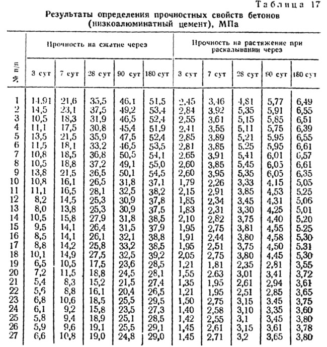 К примеру, прочность бетона на 7 сутки при соблюдении условий затвердевания, для марки М50 составляет: набор прочности бетона на 7 день = 46 * lg7 / lg28 = 27,15 (МПа) или 60% от марочной прочности.