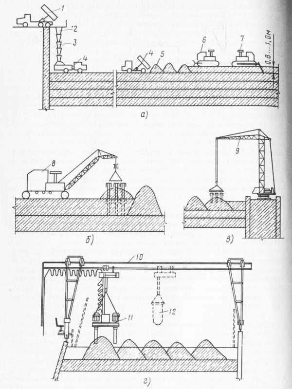 Рис. 13. Схема бетонирования колонн высотой до 5 м (а) и более (б), с густой арматурой балок (в), опалубки со съемным щитом (г): 1 — опалубка, 2 — хомут, 3 — бадья, 4 — вибратор с гибким валом, 5 — приемная воронка, 6 — звеньевой хобот, 7— навесной вибратор, 8, 9— карманы. 10 — съемный щит