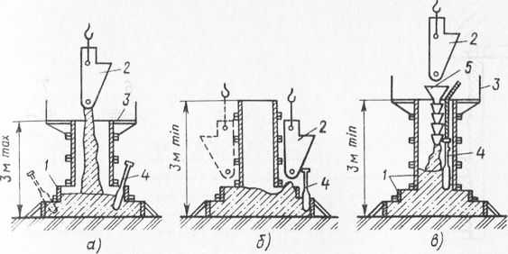 Колонны высотой до 5 м бетонируют непрерывно на всю высоту. Бетонную смесь загружают сверху с помощью бадьи или гибкого хобота манипулятора бетоновода и уплотняют глубинными вибраторами.