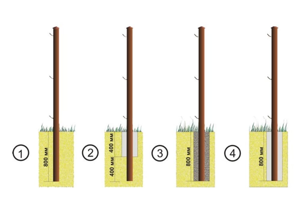 Этот способ монтажа хорош еще и тем, что обеспечивает эффективный дренаж в тяжелых суглинистых и глинистых почвах. Благодаря высокой водопроницаемости забутованного отверстия влага уходит в нижние горизонты, и не замерзает вокруг столба.