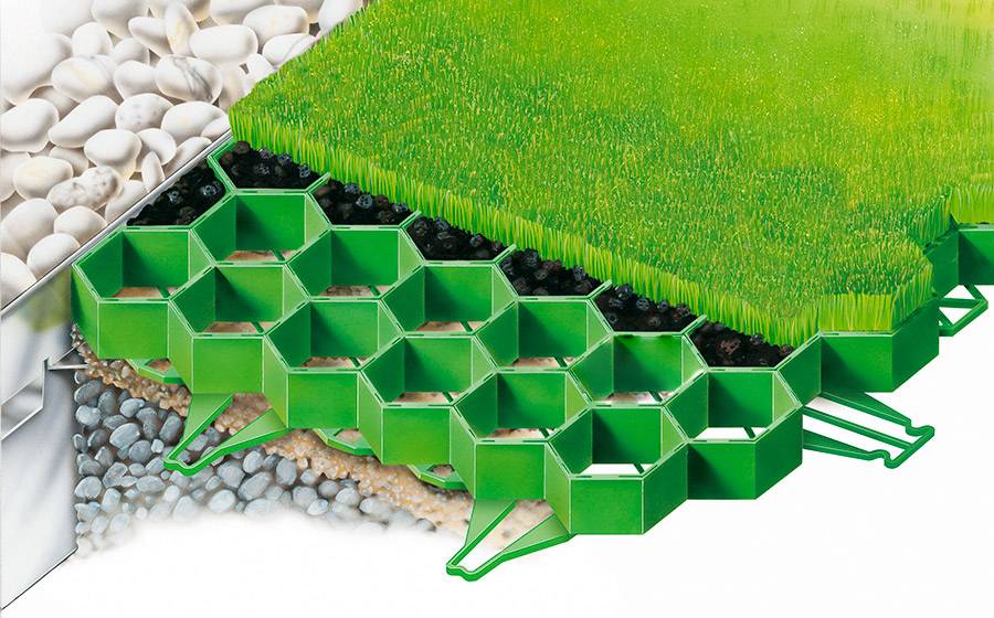 Эстетичность. Пластиковую решетку можно полностью покрыть грунтом, ребра решетки практически не будут видны сквозь стебли травы. Получается более натуральный газон, чем в случае с бетонной решеткой.