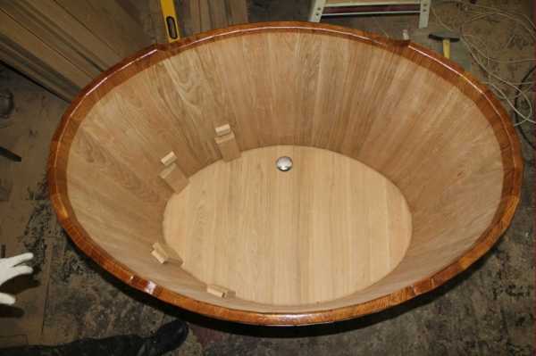 - Сборка дна для купели. Рейки из древесины соединяются между собой в квадратной или прямоугольной форме на клей. Заготовка шлифуется и вырезается в виде круга или овала. В днище вырезается сливное отверстие.