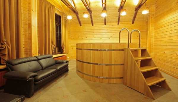 На фото — интерьеры бань с купелью в различном стиле: это может быть бетонный котлован на уровне пола или большая деревянная бочка с лесенкой. Выбор моделей зависит от индивидуальных предпочтений, но наличие бетонного бассейна в котловане нужно предусмотреть еще на этапе проектирования здания для бани.