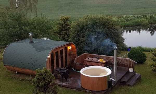 В завершение деревянная бочка для бани монтируется в выбранном месте с подсоединением к сливному отверстию. При необходимости она оснащается лестницей для спуска, лавочкой для сидения, системой подогрева и прочими полезными опциями.