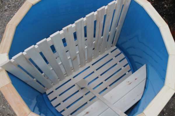 Менее трудоемкий вариант с сохранением особого уюта деревянной отделки – приобрести пластиковую емкость купели для бани и отделать ее снаружи декоративными рейками.