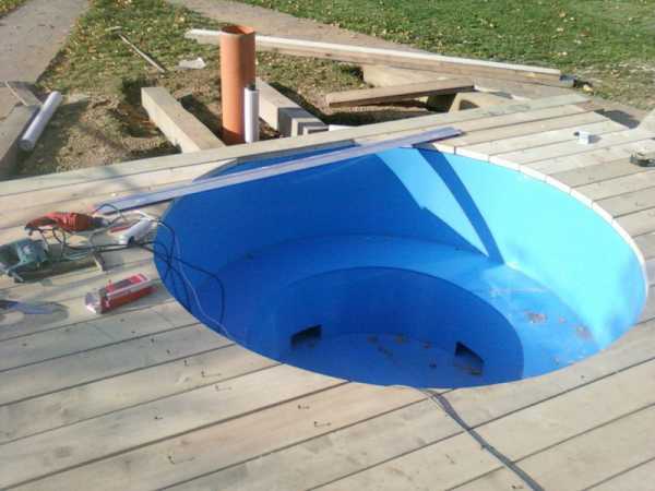 Каркас снаружи обтянут плотной пленкой с армированием, которая закрепляется досками или горбылем. Важно удержать бетонный раствор так, чтобы он не продавился внутрь каркаса. Установив конструкцию внутрь, промежуток между стенками котлована и прибитыми досками заполняется бетоном (для уменьшения расхода бетона можно сначала засыпать строительным мусором — битым бетоном или кирпичом). Когда бетон схватиться, можно ставить пластик и заниматься облагораживанием бортиков.