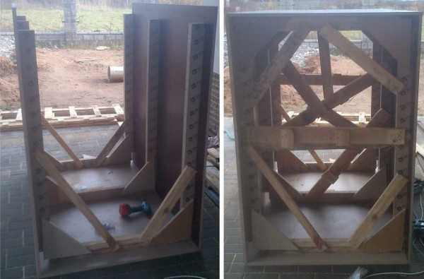 Сразу можно сказать, что при строительстве опалубки надо стенки укреплять не только для компенсации распирающих усилий бетона. Надо еще и делать саму конструкцию прочной, так как ее надо будет поднимать краном или лебедкой (вес этой опалубки — более 100 кг).