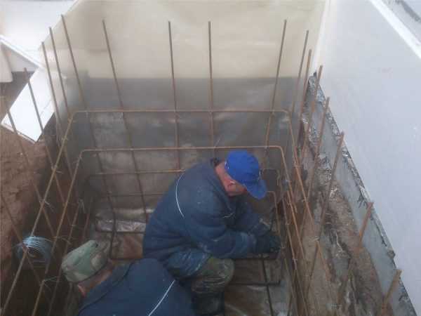 Котлован выложен плотной пленкой — 200 мкн. В тех местах, где купель примыкает к фундаменту, пленка зафиксирована к стенам. Сразу надо сказать, что крепить ее надо прочно, возможно, прижимными планками (при работе несколько раз срывали, также ее обрывало бетоном). По двум другим сторонам ее просто прижали кирпичами и проблем не было.