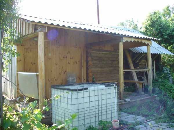 Бюджетный вариант банной купелиЕще вариант — использовать в качестве купели кубовую емкость для воды. Она продается сразу с металлической подставкой. Все что надо — срезать у полставки верх и установить по своему усмотрению. Если хотите — можно забетонировать, как на фото ниже.