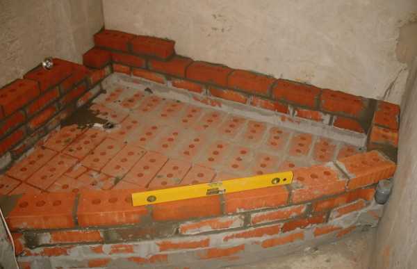 Арматура должна находится в толще бетона, потому снизу под прутки подложен кирпич. Также прутья отстоят от стенок на 7-8 см. Минимум 5 см, но так как среда влажная, и общая толщина стенки купели будет порядка 15 см, сделали арматуру примерно посередине.