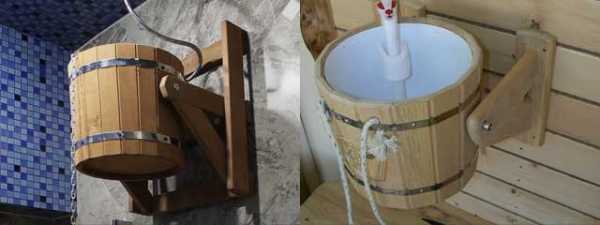 - Обливные. Устройства представлены объемным ковшом, который используется для обливаний в тех случаях, когда нет возможности установить полноценный бассейн. Обливное ведро монтируется на стену и оснащается опрокидывающим механизмом.
