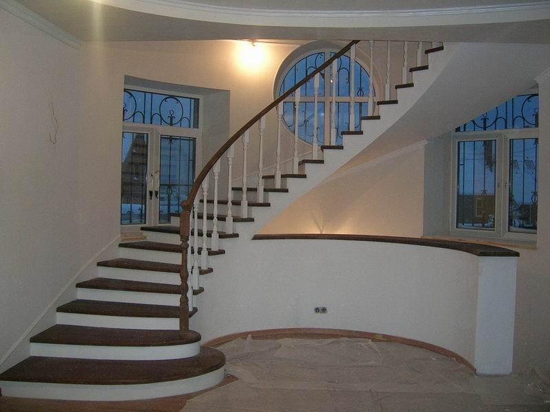 Винтовая лестница. Наиболее сложная в монтаже конструкция. Из-за закругления ступеней такая лестница занимает больше всего полезной площади, порядка 9,5 квадратных метров. Больше подходит как украшение интерьера в большой зале или как наружная лестница.Винтовая лестница крепиться только к полу и потолку и не имеет дополнительных опор. При армировании нельзя допускать разрыва арматуры.