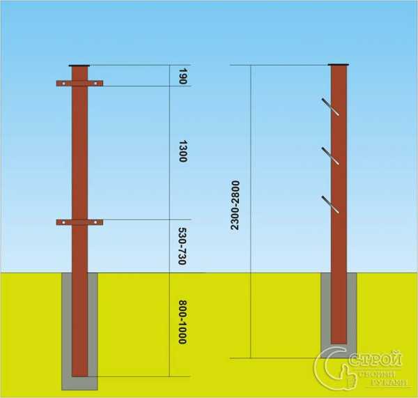 - Подготавливаются ямки под опорные столбы. Глубина их залегания зависит от типа грунта — на обычном достаточно 75 см (многие утверждают, что хватит 50, но лучше перестраховаться), на сложном (пучинистом) — 1,2 метра.