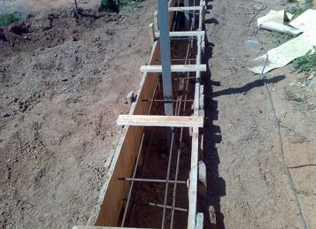 Арматурный каркас вяжут мягкой стальной проволокой из стержней диаметром 8—12 мм таким образом, чтобы размеры ячеек составляли 100—150 мм. Затем каркас опускается в траншею и связывается с металлическими столбами. Чтобы бетон полностью укрывал стержни, под каркас нужно сделать подставки высотой не менее 5 см, на этом армирование закончено.