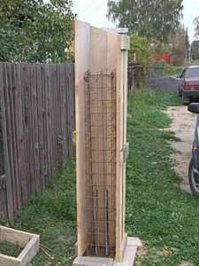 - Далее при самостоятельной заливке столба делается опалубка из досок. Опалубка будет представлять собой длинный ящик с размерами изнутри соответствующими столбу. Опалубку изнутри нужно обить полиэтиленом или закрепить степлером рубероид для того, чтобы после схватывания бетона её можно было легко снять.