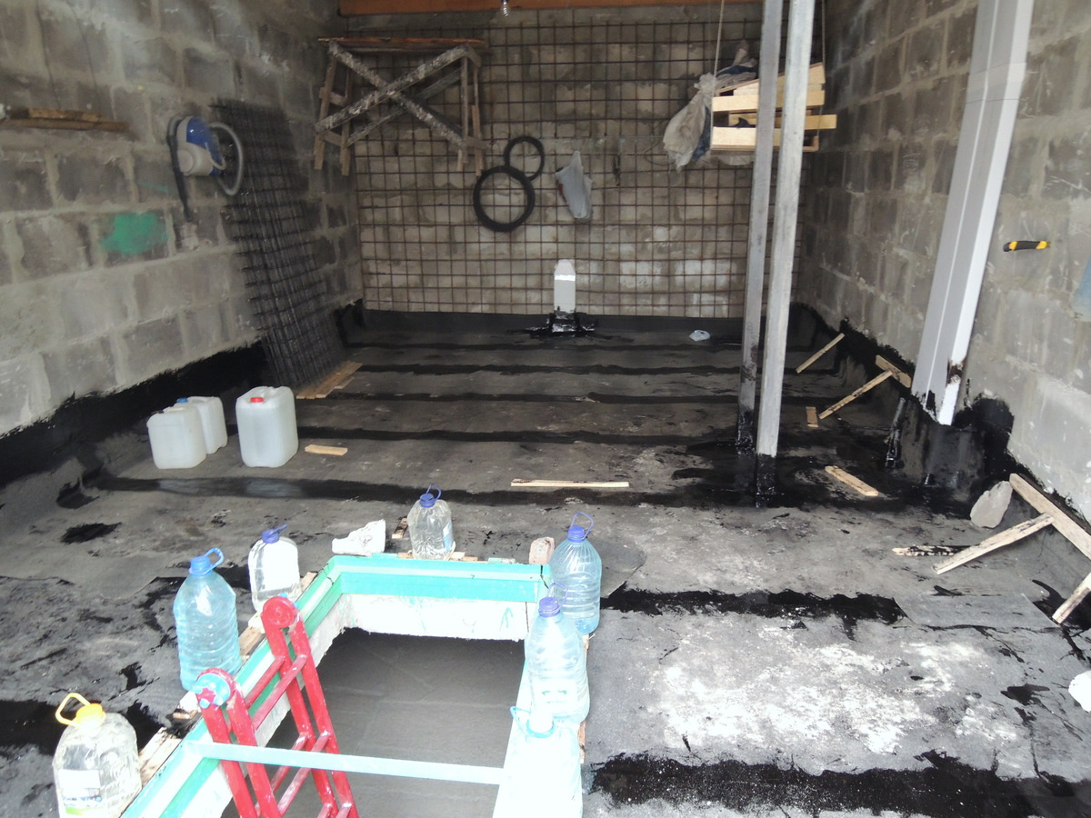 Для этого используют полиэтиленовую пленку, рубероид или любой другой рулонный материал с абсолютной влагостойкостью. Его укладывают по всей поверхности основания с нахлестами полос друг на друга в 15 см и с таким же припуском на стены. - Гидроизоляционный материал укладывают аккуратно, он должен лежать ровно, не образую складок или вмятин. Припуск, оставленный по краю, должен быть выше финишной высоты бетонного пола в гараже. Чтобы он не мешал при бетонировании, его рекомендуется зафиксировать к стене.