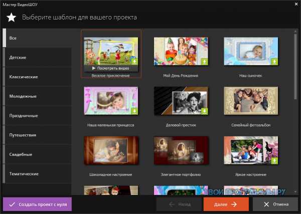 Удобный качественный софт для создания интересных видеороликов с помощью профессиональных титров, шаблонов, переходов и музыкальных настроек. Шаблоны сортируются по различным тематикам, к ним можно применять фоновую музыку, записи с микрофона, 3D-эффекты и фотографии. Готовый проект получается небольшого качества для воспроизведения на гаджетах, открытия в социальных сетях, на ресурсах или телевизоре. Видеоролик можно записать с интерактивным меню на DVD, настроить анимацию с тонкими параметрами, наложить поверх ролика фото или текст, а также применить эффекты снега, фейерверка, огня, дождя и др. Пробная версия работает 10 дней.